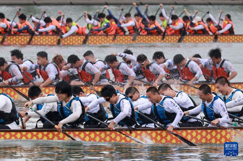6月10日,上海海洋大学队(前)在龙舟赛高校组的比赛中。