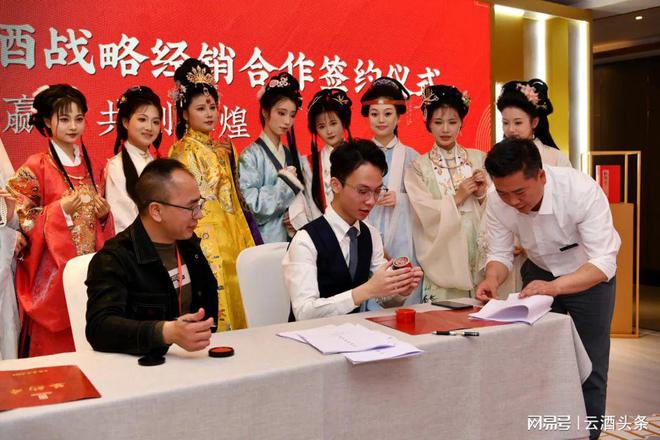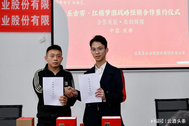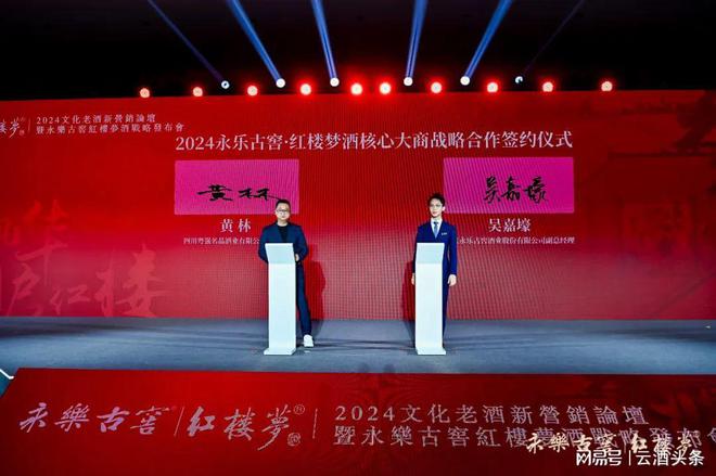 在活动中,四川粤强名品酒业有限公司总经理黄林和宜宾永乐古窖酒业股份有限公司副总经理吴嘉壕,出席“2024永乐古窖·红楼梦酒核心大商战略合作签约仪式”,达成合作。