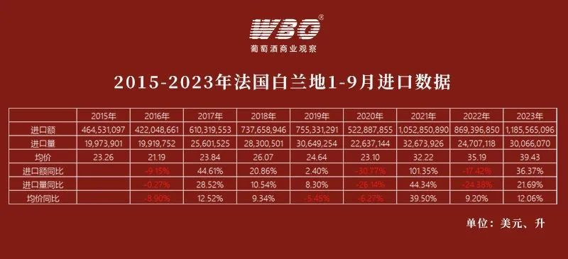 而从今年1-9月的进口数据来看,法国白兰地进口量、额同样双双大幅增长,进口额同比增幅36.37%,进口量同比增幅21.69%,完全扭转了2022年下滑的趋势,并且进口均价仍呈现两位数的增长,目前已达到近40美元/升。