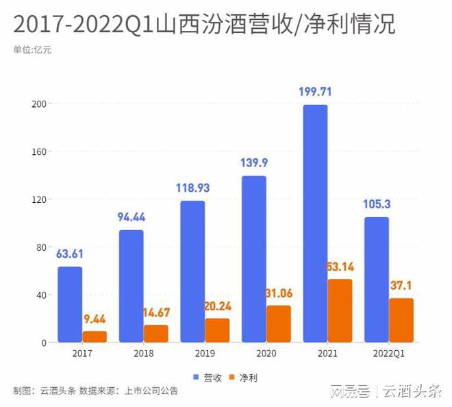 汾酒成功穿越疫情影响,2021年已经位居行业第五。2022年一季度,汾酒实现营收105.3亿元,进位至白酒行业第四,更拉近了与前三的距离,业内外对于汾酒高质量发展的信心进一步增强。