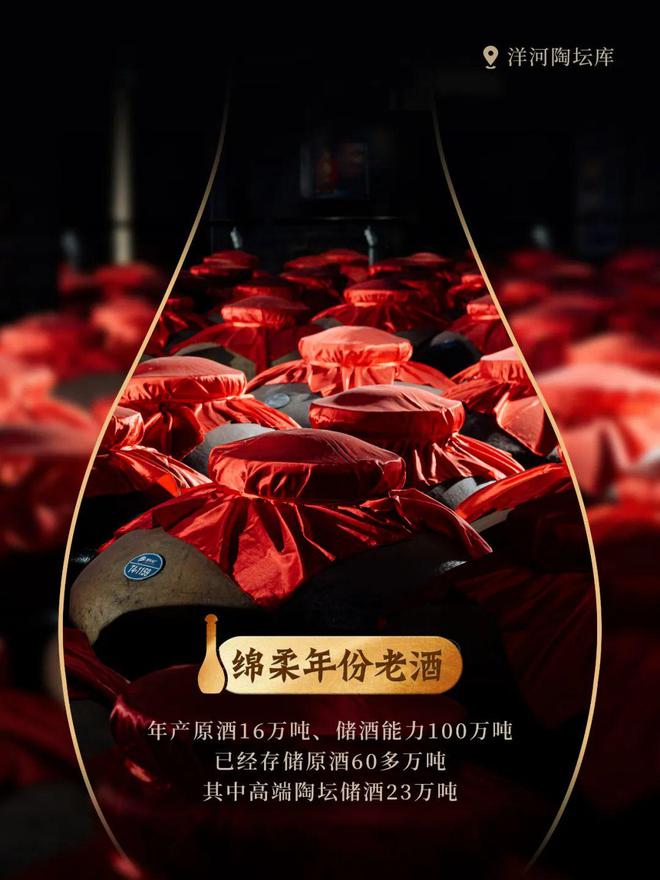 目前,洋河已拥有名优窖池7万多口,1000多个酿酒班组,年原酒产能超过16万吨、储酒能力100万吨,目前已经存储原酒60多万吨,其中高端陶坛储酒23万吨,为老酒战略的实施提供了充足的资源。