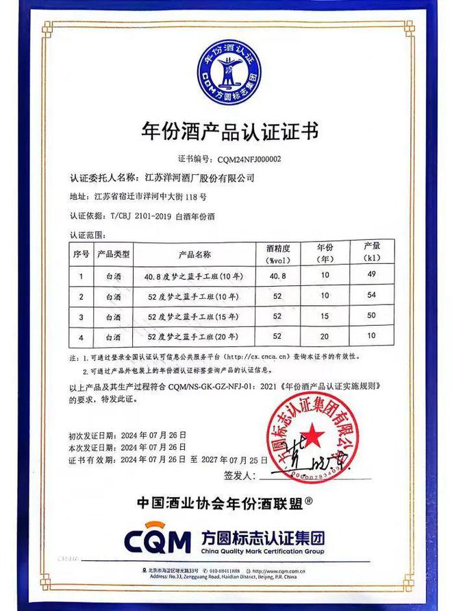 近日,洋河股份旗下的梦之蓝手工班完成年份酒认证,梦之蓝手工班系列产品也成为首家获得“中国酒业协会”授权、由第三方监管机构“方圆标志认证集团有限公司”权威认证的中国高端年份白酒。
