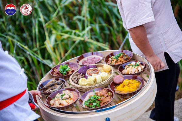 傍晚时分,茅台以一场盛大而温馨的长桌宴——“高粱丰筵”,热情款待四方来宾,以“丰收九大碗”的形式,精心呈现了仁怀地域的饮食文化与酒文化特色,也让嘉宾们享受到了来自土地的馈赠和农民辛勤劳作的成果。而随着夜幕降临,一场更加震撼人心的视听盛宴也正式开启,以《多彩迎丰》为序曲,缓缓铺陈出一幅贵州地方民俗画卷。