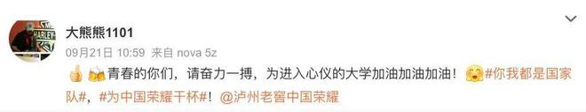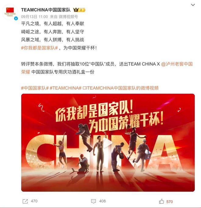 其中,一条由TEAM CHINA/中国国家队与泸州老窖联合发起微博话题#你我都是国家队#热度持续攀升,目前的微博阅读量已破亿。