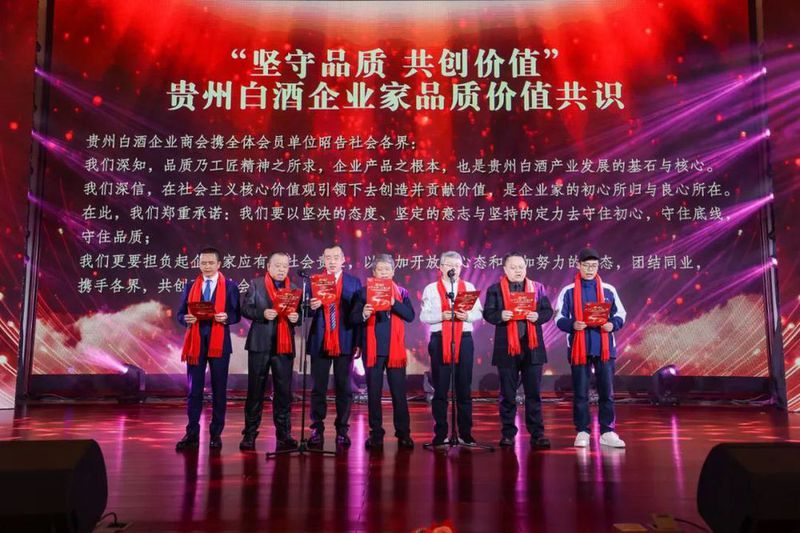 在丁远怀带领下,商会代表共同发布了“坚守品质·共创价值”贵州白酒企业家品质价值共识,并郑重承诺: