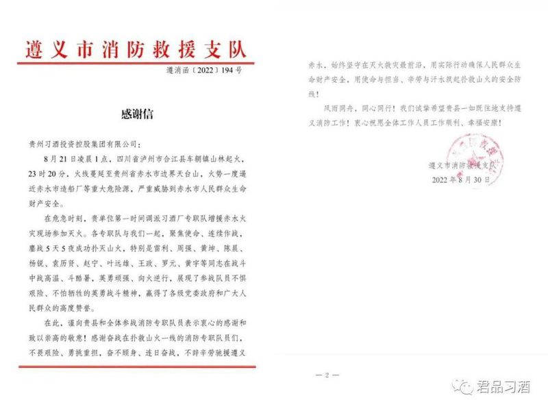 1场山火、2次救援、11名消防战斗员、120个小时奋战……一个个数字的背后,是使命、是信念、是担当,更是习酒人对这片土地的热爱。为了感谢习酒的这份热爱,遵义市消防救援支队发来了一封感谢信,字里行间书写着对习酒挺身而出驰援赤水山火的敬意。