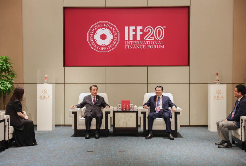 在晚宴前,曾从钦与国际金融论坛(IFF)联合主席、联合国大会主席理事会主席韩升洙进行了会谈。曾从钦介绍了五粮液悠久历史、匠心酿艺、多元布局等。他希望与论坛加强沟通、深入合作,发挥优势,为推动全球可持续发展贡献力量。