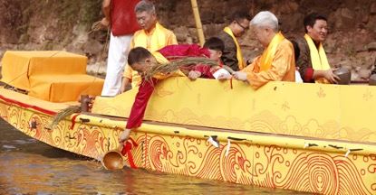 以“九”为吉时,祭祀礼官一声令下,酣客君丰总工程师佘荣书作为取水官,乘船前往赤水河中心。恭取三瓢河水,高声诵读《取水奏》,感恩天地自然的庇佑。