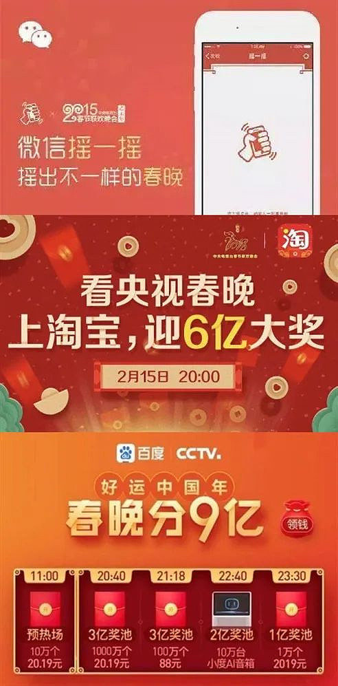 从2014年微信靠春节红包将微信支付带入市场后,2015年腾讯以5303万元拿下央视羊年春晚独家合作权,通过“摇一摇”发放5亿现金红包,红包大战就此拉开序幕,互联网大战的硝烟燃至春晚舞台。