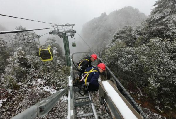 近日,张家界连降大雪。1月2日,张家界旅游集团股份有限公司在打出“冬游张家界,畅享人间仙境”的同时,加强安全防护工作,数百名员工除冰扫雪,保护山道、索道及景观设施安全。公司工作人员向记者介绍,“我们采取一天两班、一日一检的方式巡查旅游线路上的关键点,为春节游客守护平安。”