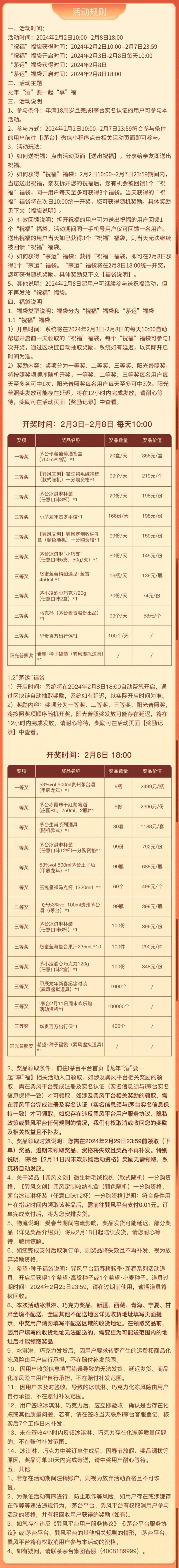 2月3日至2月8日每天10:00会开启前一天的福袋,每个“祝福“福袋都会有奖哦!而且活动期间收集到的所有“祝福”福袋,还能在2024年2月8日18时参与抽取终极大奖——“茅运”福袋!大奖福袋里的奖品更是壕到不行,绝对让你大呼过瘾!