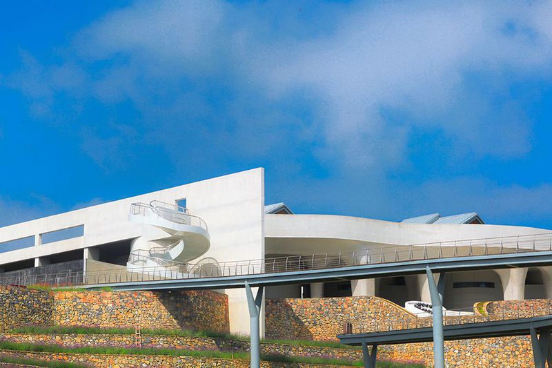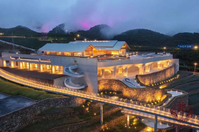 天宝峰之巅,郎酒庄园地之阁顺应山势、向东而立,有紫气东来的美好寓意。地之阁整体建筑设计形似一柄玉如意,以如意桥为玉柄连接两端,匠心独运。
