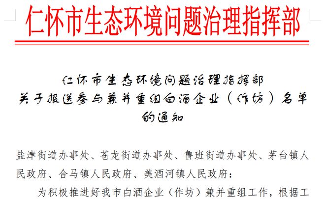 据悉,本次涉及的区域包括仁怀盐津街道、苍龙街道、鲁班街道、茅台镇、合马镇、美酒河镇几个地区,相关工作由仁怀市生态环境问题治理指挥部主导,按照自愿参与的原则由企业先行登记申请。
