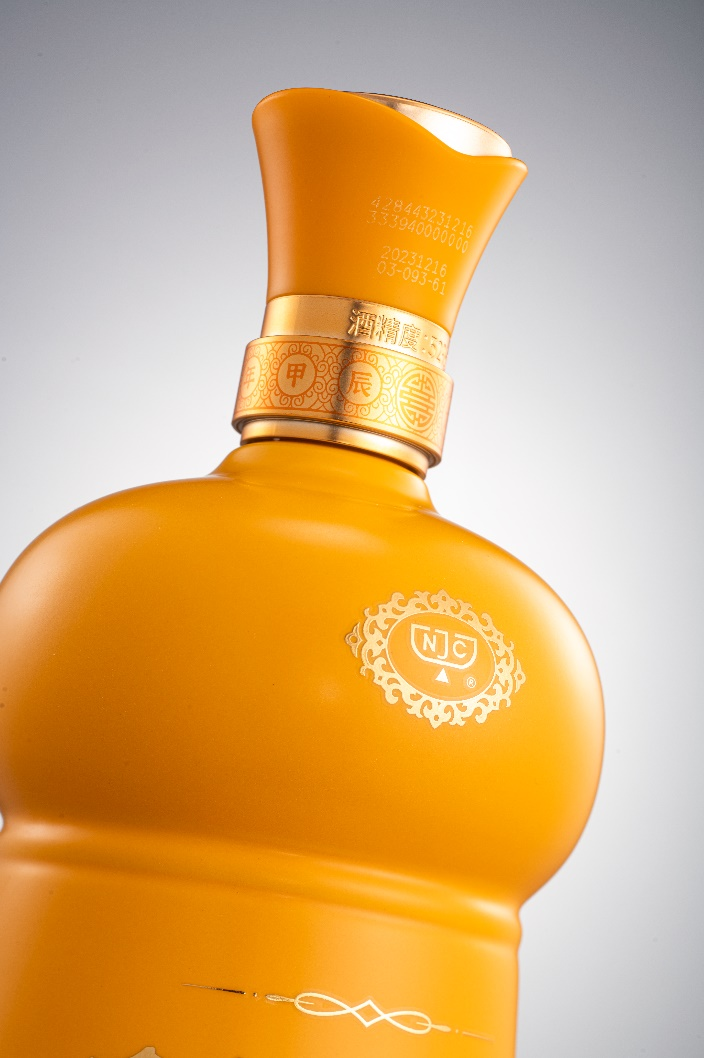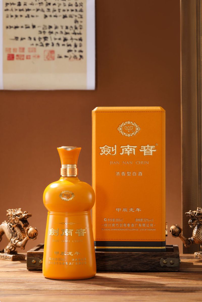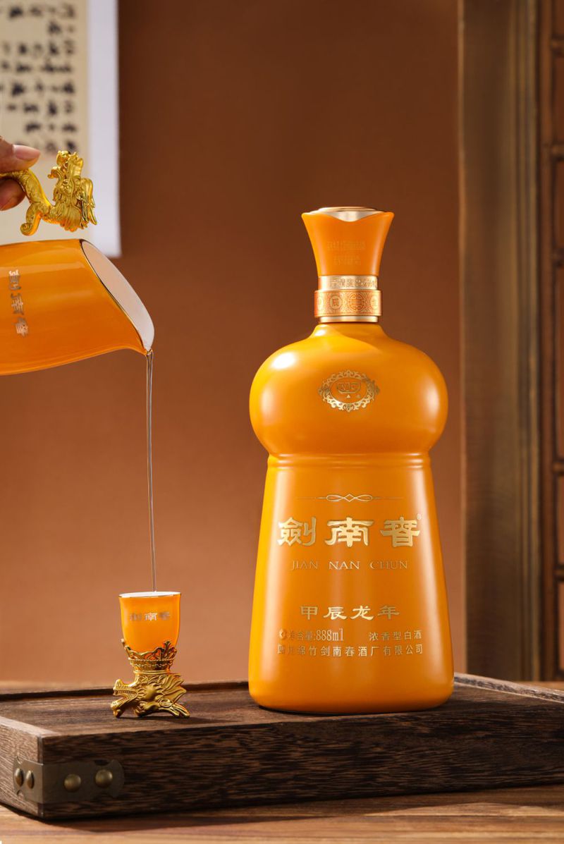 产品包装采用皮革材质外盒,以金黄色为主色调,整体风格奢华大气。酒瓶与剑南春传统瓶型一脉相承,使用陶瓷材质,温润之中彰显底蕴。888ml大容量则寓意财源滚滚,心想事成。瓶颈处烧刻甲辰龙年四字,绘以中国传统纹饰,展现东方艺术的内敛精致之美。