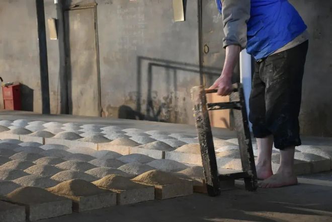 在后续的安曲、翻曲、堆曲过程中,曲块间必须要保证空气和微生物的充分流通,让微生物的生长和繁殖更加活跃。为此,全兴创造了桃花曲特别的堆积方式——人字形摆放,让曲块自然堆积升温到50-60℃。
