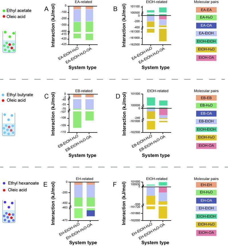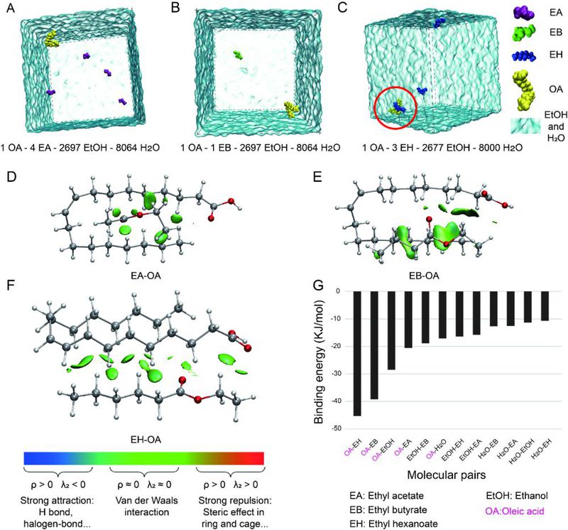 分子动力学模拟和量子化学计算发现,乙酸乙酯、己酸乙酯、乙醇和其他分子间的吸引力因油酸的添加而增强;丁酸乙酯则刚好相反。油酸改变52%乙醇水体系中乙酯、乙醇和其他分子的弱相互作用力。增强乙酸乙酯、己酸乙酯和其他分子间的吸引力,导致其挥发被抑制;相反地,丁酸乙酯和其他分子间的吸引力因油酸的添加而降低。并且通过量子化学计算发现,在测试的简化模拟体系中,长链脂肪酸与三种酯类化合物之间形成二元复合物时释放的自由能较其他分子对更多,其中油酸/己酸乙酯分子对可以形成较为稳定的二元复合物,自由能最低。