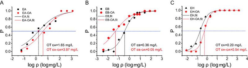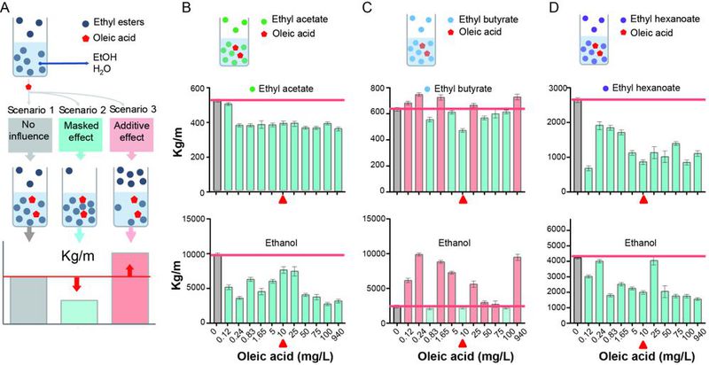 以油酸作为长链脂肪酸的代表,配置简化溶液,研究其对三种乙酯挥发性的影响,发现乙酸乙酯、己酸乙酯的挥发被油酸抑制,从而降低其嗅觉感知强度;油酸对丁酸乙酯的作用相反。添加油酸会抑制乙酸乙酯、己酸乙酯挥发,kg/m分别降低4%-31%和27%-74%,相反地,丁酸乙酯和其他分子间的吸引力因油酸的添加而降低,其挥发被促进,kg/m增加,940mg/L油酸添加量时察觉阈值由0.36 mg/L降至0.05 mg/L。