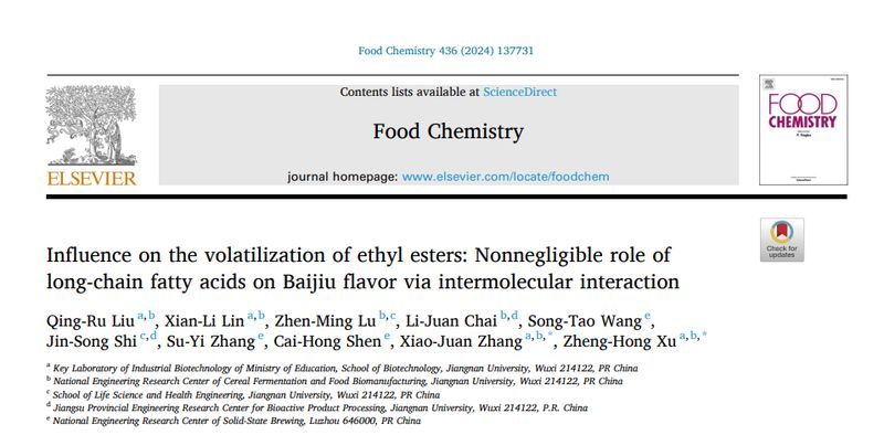 近日,泸州老窖国家固态酿造工程技术研究中心沈才洪主任团队联合江南大学许正宏教授(现为四川大学教授)团队在国际食品Top期刊《Food Chemistry》(Q1,IF: 8.8)发表题为“Influence on the volatilization of ethyl esters: nonnegligible role of long-chain fatty acids on Baijiu flavor via intermolecular interaction”的研究性论文。江南大学生物工程学院博士研究生刘青茹为第一作者,粮食发酵与食品生物制造国家工程研究中心许正宏教授、张晓娟教授为论文通讯作者。