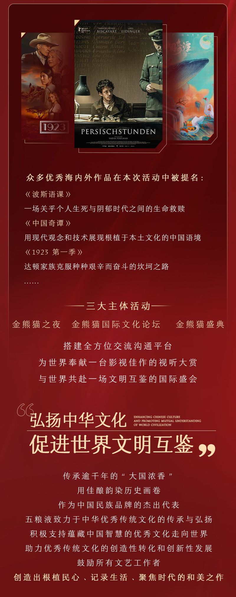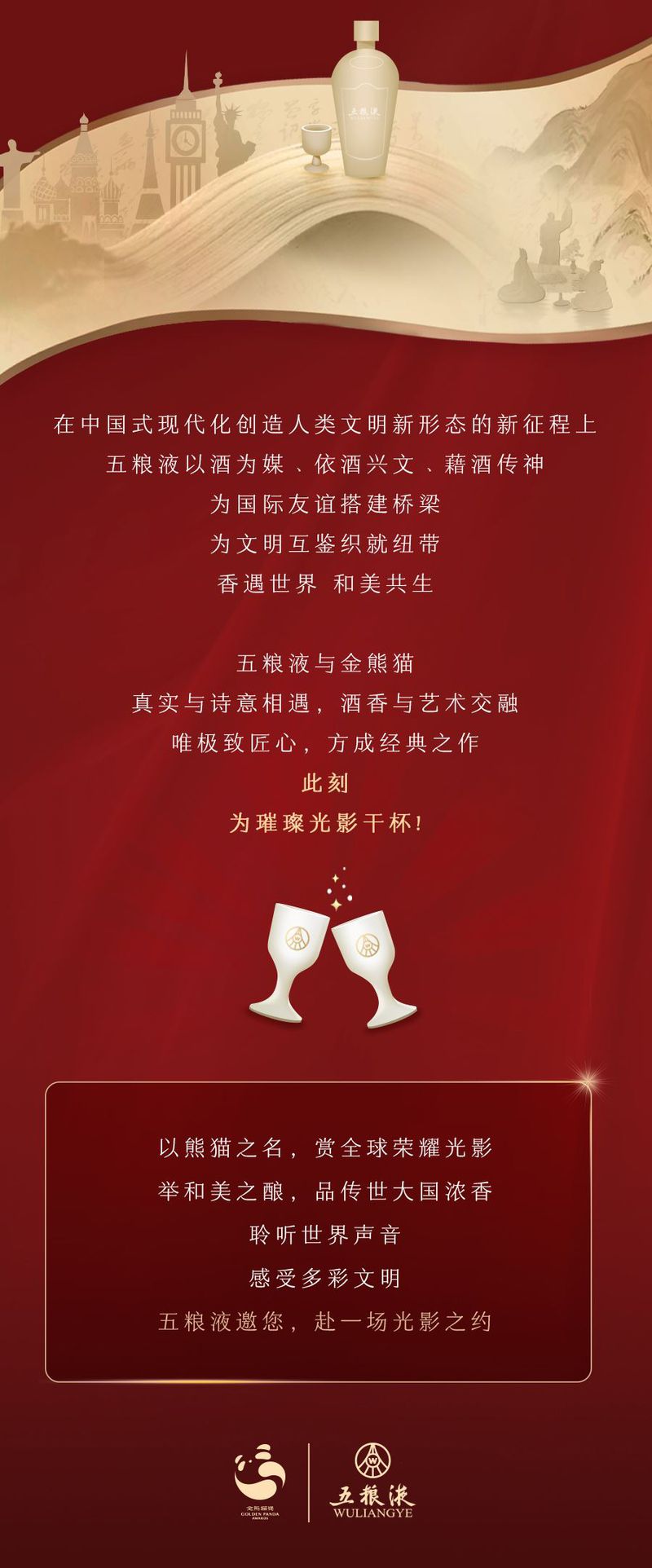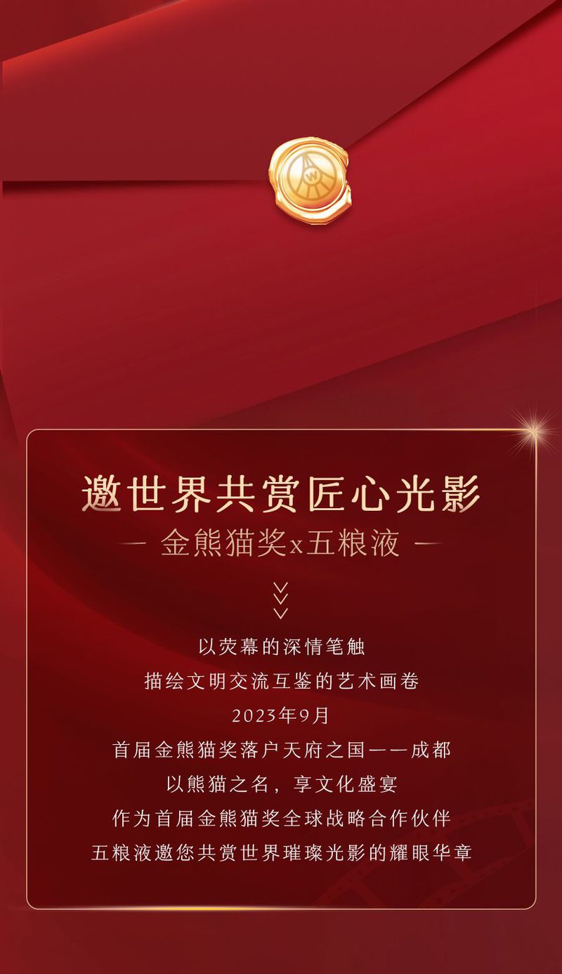 金熊猫奖&五粮液,邀世界共赏匠心光影2023年9月19日和美时光,邂逅经典。首届金熊猫奖全球战略合作伙伴五粮液邀您“香”约蓉城,共赏世界璀璨光影华章,以熊猫之名,享文化盛宴,在五粮酒香与艺术交融的极致匠心中,邂逅传世经典之作,为中华文化、为世界多彩文明干杯!