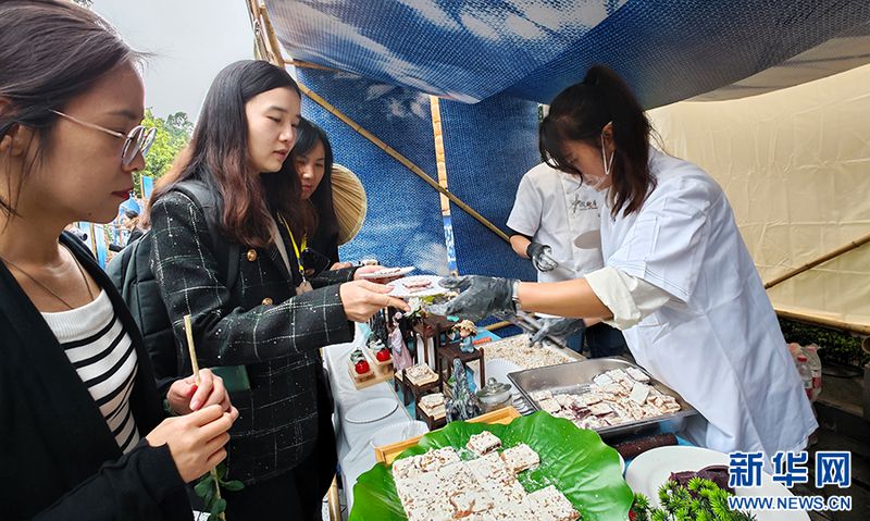 10月11日,嘉宾在茅台酒节非遗市集品尝美食。新华网 卢志佳 摄