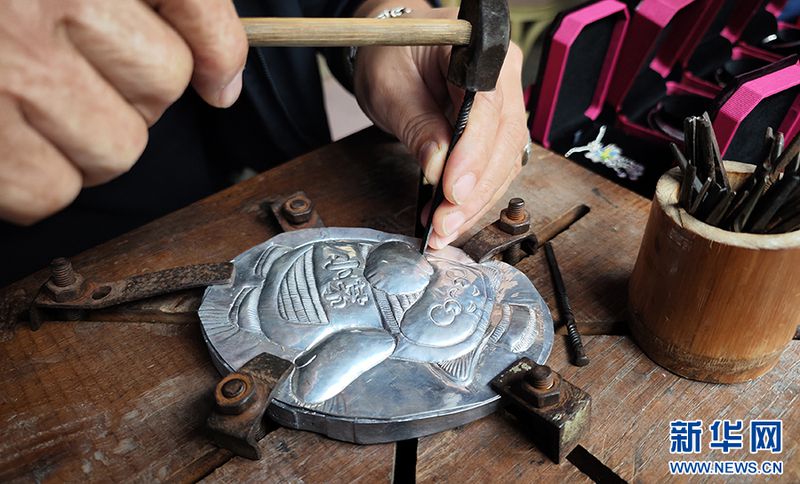 10月11日,贵州苗族银饰非遗传承人在茅台酒节用银锻造茅台“小茅”形象。新华网 卢志佳