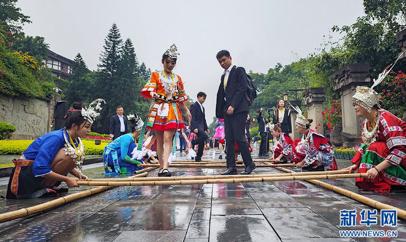 10月11日,参加茅台酒节的嘉宾在茅台中国酒文化城体验竹竿舞。新华网 卢志佳 摄