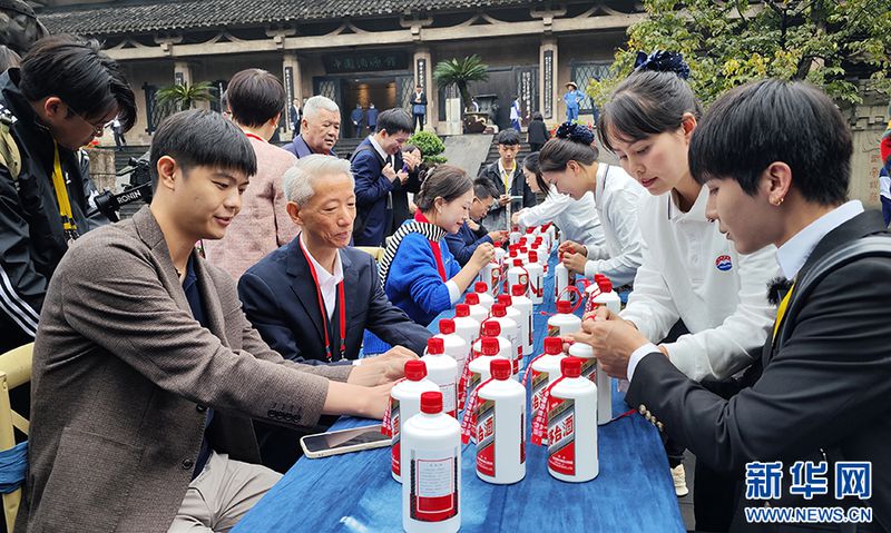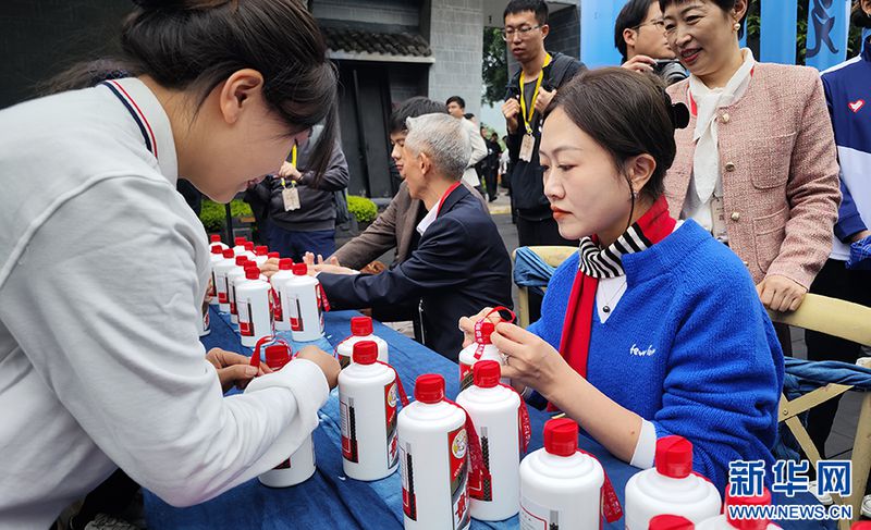 10月11日,参加茅台酒节的嘉宾在茅台中国酒文化城体验茅台栓丝带。新华网 卢志佳 摄