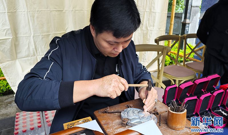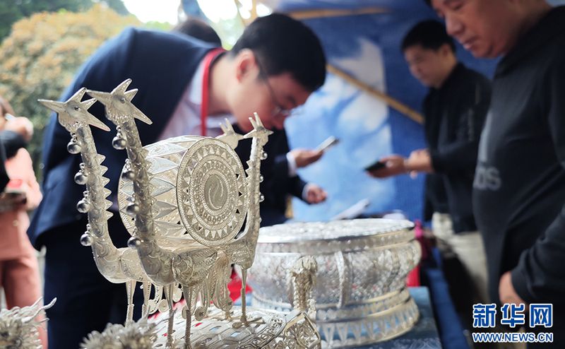 10月11日,贵州苗族银饰非遗传承人在茅台酒节用银锻造茅台“小茅”形象。新华网 卢志佳 摄