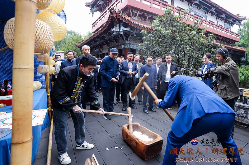 活动中通过礼敬先贤、恭读《敬文》和拜师礼等形式,表达了茅台人对天地自然的敬畏,对古法工艺的坚守,对先贤宗师的敬仰。当天,在茅台中国酒文化城还设置了非遗集市和酱酒工艺互动体验,展示非遗与茅台美酒相遇的美好,拓展了酒文化的边界。