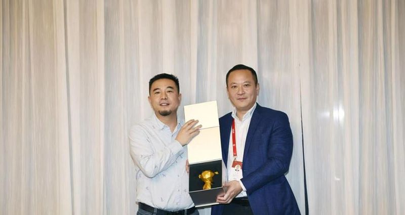 ▲京东集团高级副总裁姚彦中(左)与五粮液集团公司党委副书记、副董事长、总经理邹涛(右)互赠礼物