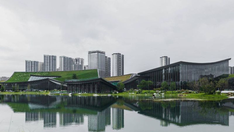 入口处,天府人文艺术图书馆和当代艺术馆相对而立,弧面屋顶连缀如山脉连绵起伏,湖滨商业街区天府111的人流络绎不绝,对岸天府美术馆的白色花瓣与湖水中的倒影默自对话。