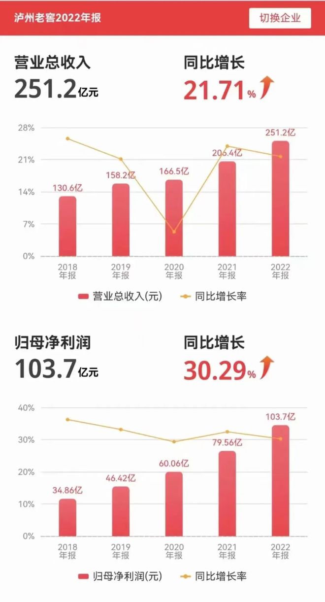 报告显示,泸州老窖在2022年实现营业收入251.24亿元,同比增长21.71%;实现净利润103.65亿元,同比增长30.29%。在这份成绩单中,泸州老窖不仅年度销售业绩再创历史新高,年度净利润更是首次突破100亿元,这也是自去年三季报泸州老窖利润超越2021全年后,持续高质量发展的重要表现。