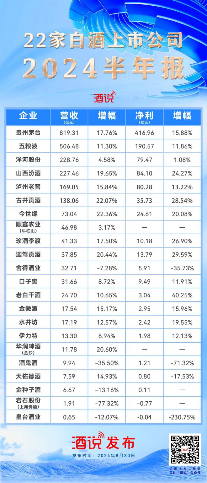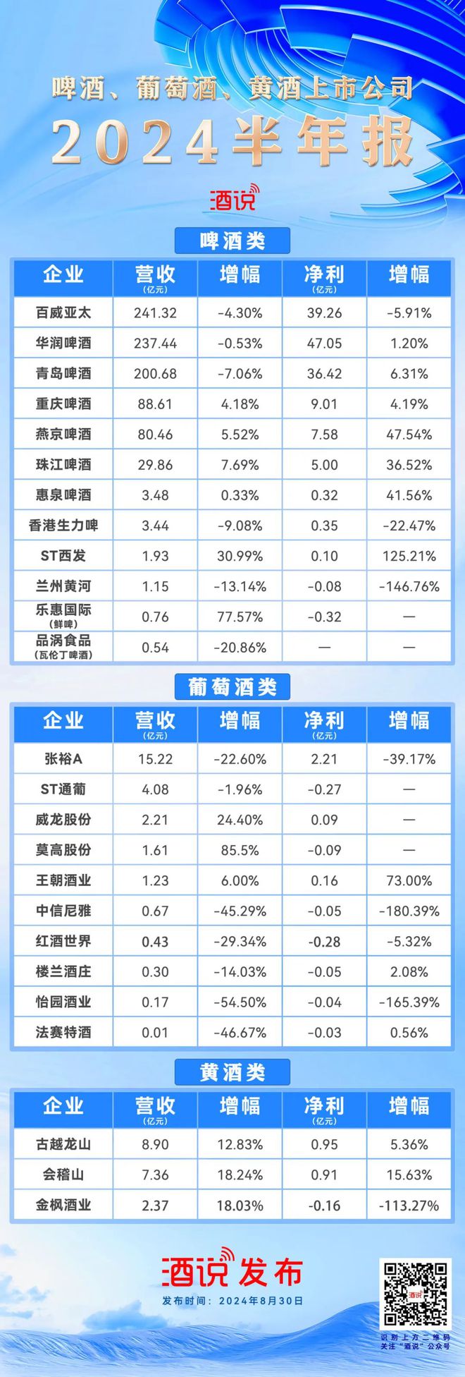 截至8月30日晚,白酒、啤酒、葡萄酒、黄酒上市公司2024半年报已全部出炉,酒说整理制图如下: