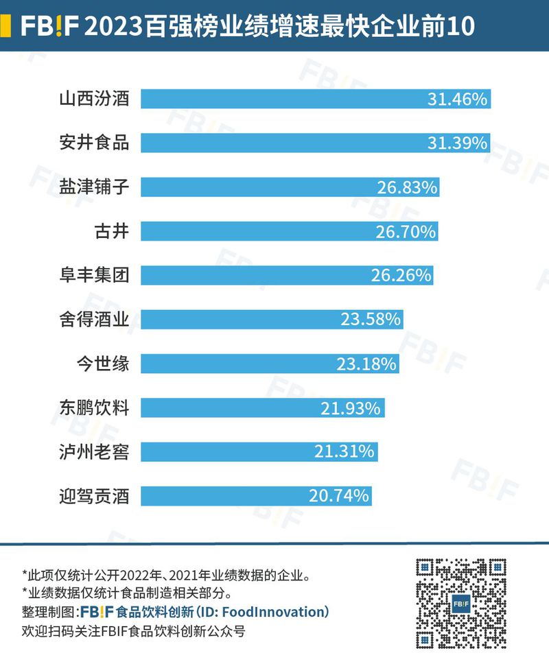 其中,增速最快企业为山西汾酒(FBIF2023百强榜第14位),业绩增速为31.46%。而上一年度增速第一是舍得酒业,增速为94.77%。相较而言,榜首增速在下降。并且,此次数据显示,舍得酒业降至第六,酒鬼酒跌出增速前十榜单。增速前十入榜门槛也由38.07%降至20.74%,整体增速放缓。