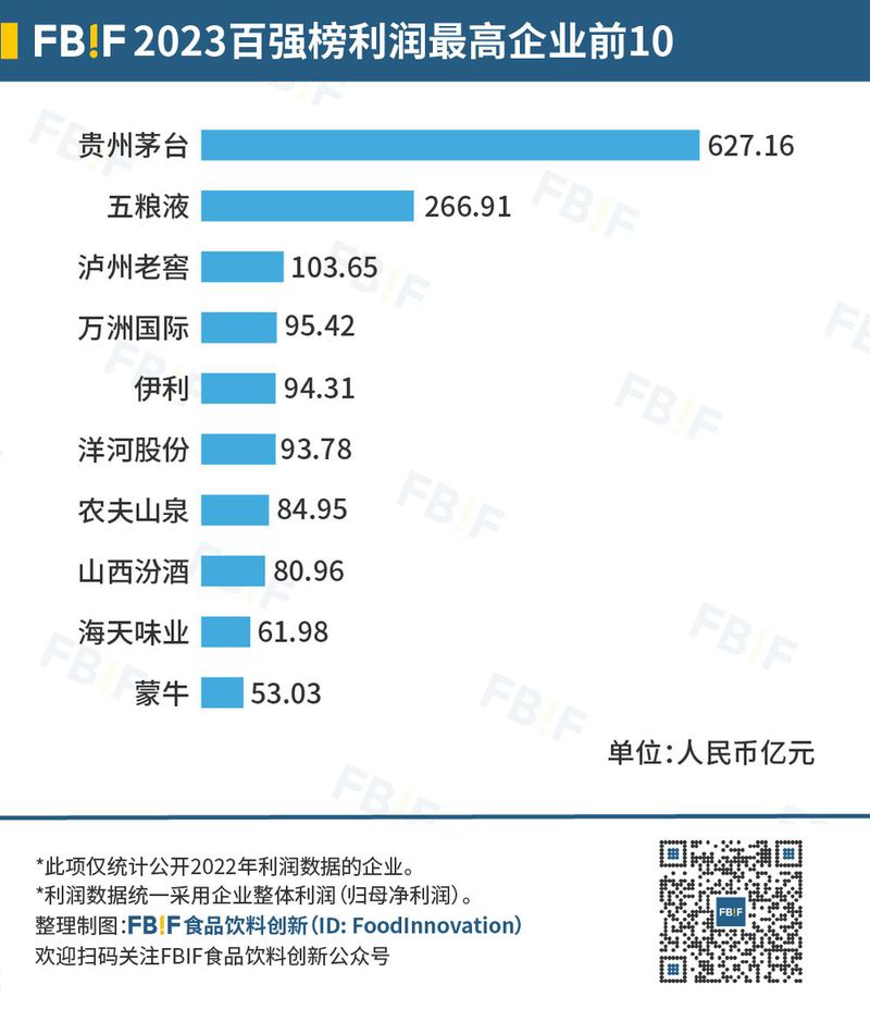 而论及利润,FBIF2023百强榜也被酒类占领一半,并和其他主要品类拉开了巨大差距。茅台、五粮液分别以627.16亿元、266.91亿元的利润蝉联榜单前两位,并且较上年利润均有增长。泸州老窖103.65亿元的成绩再次反超伊利,位居榜三。同时茅台也在历年FBIF百强榜都位居利润榜第一,并不断刷新利润记录。