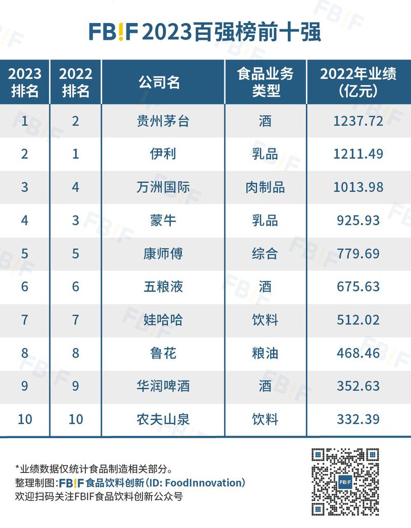 9月18日,FBIF发布《2023中国食品饮料百强榜》(以下简称“FBIF2023百强榜”),茅台以1237.72亿元的业绩,荣登榜首。