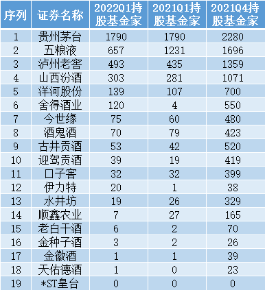 我们选取去年一季度和今年四季度持股基金家数,做同比和环比分析。这或许是乐观推断,可以看出多数酒企今年一季度持股基金家数比去年有所增长。19家企业中,有11家基金持股家数增长,4家持平,还有4家下滑。