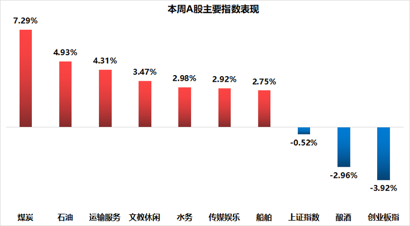 相较而言,煤炭、石油、运输服务等顺周期板块,分别上涨7.29%、4.93%和4.31%排在前三。上证指数下跌0.52%,强于创业板指下跌3.92%,市场呈现沪强深弱的特点。