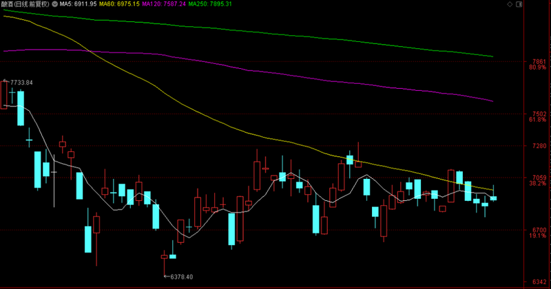 周五酿酒板块多数个股冲高回落。单从技术面分析,指数上方受限于60日均线的6975点。酒鬼酒、舍得酒业、口子窖等个股周五走势也收出较长上影,有冲高回落迹象。