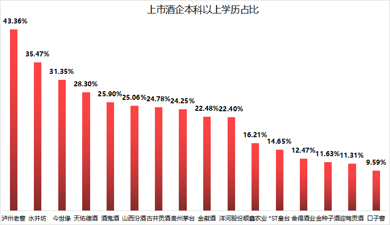 统计发现,白酒19家公司,五粮液、伊力特和老白干酒的数据不全,本科以上学历占比超过20%的公司有10家。泸州老窖最高,达到43.36%,年报显示公司员工共计3434人,其中生产人员1264人,本科以上学历共有1489名,或许可粗略算出非生产线员工和退休员工除外,泸州老窖高学历人才占比或超过70%。