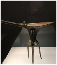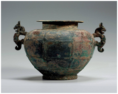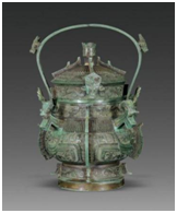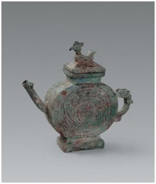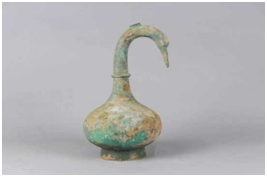 2、2020年5月从河南出土的鹅首曲颈青铜壶,青铜壶鹅首微颔、曲颈优雅,低垂的腹部巧妙化作壶身,静卧于圈足之上。据三门峡市文物考古研究所所长郑立超介绍,“当时的壶首多呈蒜头状,鹅首曲颈造型颇具个性,实属罕见。根据液体的检测报告,此壶应该是酒器,可从壶顶小孔倒出美酒。