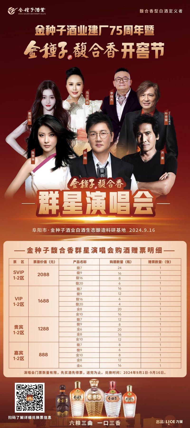 殿堂级歌手孙楠、歌坛天后陈慧琳、情歌天王齐秦……7位顶级唱将于9月16日晚,汇聚在金种子酒业白酒生态酿造科研基地,共同为城市的节日喝彩,并唱响金种子馥合香的好声音。
