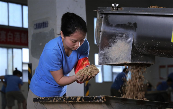 茅台一名工人在制曲车间查看曲醅厚度。卢志佳 摄