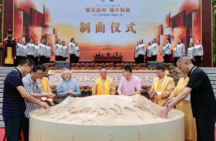 “百年郎酒,生生不息;传世工艺,代代相传;凤曲技法,绵延古今;内控准则,品质为本......”在敬颂官的主持下,郎酒集团董事长汪俊林登台宣布,2022端午制曲大典正式开启。