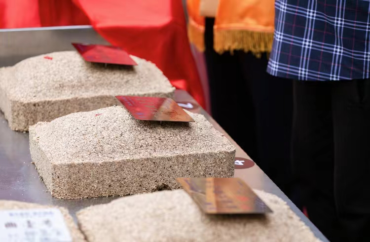 撒母曲、取水入曲、润曲等一系列虔敬动作后,参加制曲大典的各界嘉宾参与拌曲,感受传承千年制曲技艺。嘉宾以手拌粮,是为水、母曲、小麦充分融合,有利于微生物发酵,方能制出优质高温大曲。