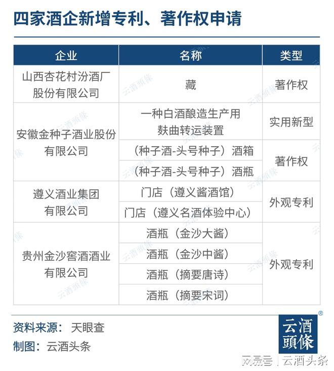 近日,天眼查显示,四家酒企分别申请专利和著作权,具体如下图。(天眼查)