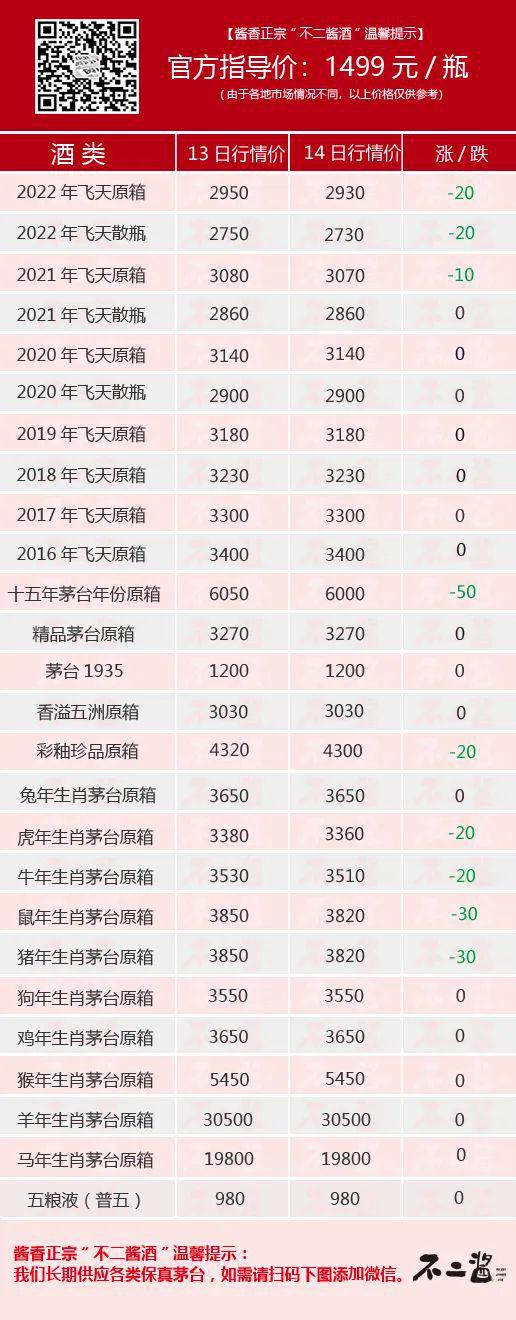 今日茅台酒行情价全览。飞天方面,2022年散瓶和2021~2022年原箱跌10~20元/瓶;生肖方面,虎年、牛年、鼠年、猪年跌20~30元/瓶;其他系列中,彩釉跌20元、十五年暴跌50元/瓶。