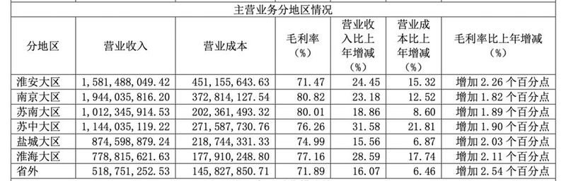 从销售区域来看,省内市场继续保持较高的增长态势。其中南京大区销售额达19.44亿元,同比增长23.18%;淮安大区销售额达15.81亿元,同比增长24.45%;苏中大区销售额达11.44亿元,同比增长31.58%;苏南大区销售额达10.12亿元,同比增长18.86%;盐城大区、淮海大区也保持高增长。
