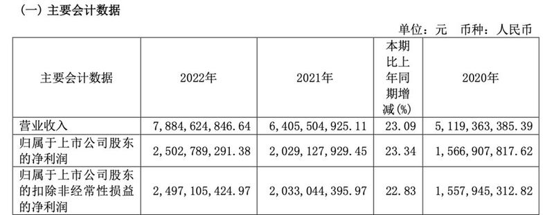 同时发布的2023年第一季度报告显示,公司一季度营业收入38.02亿元,同比增长27.26%;净利润12.55亿元,同比增长25.20%。