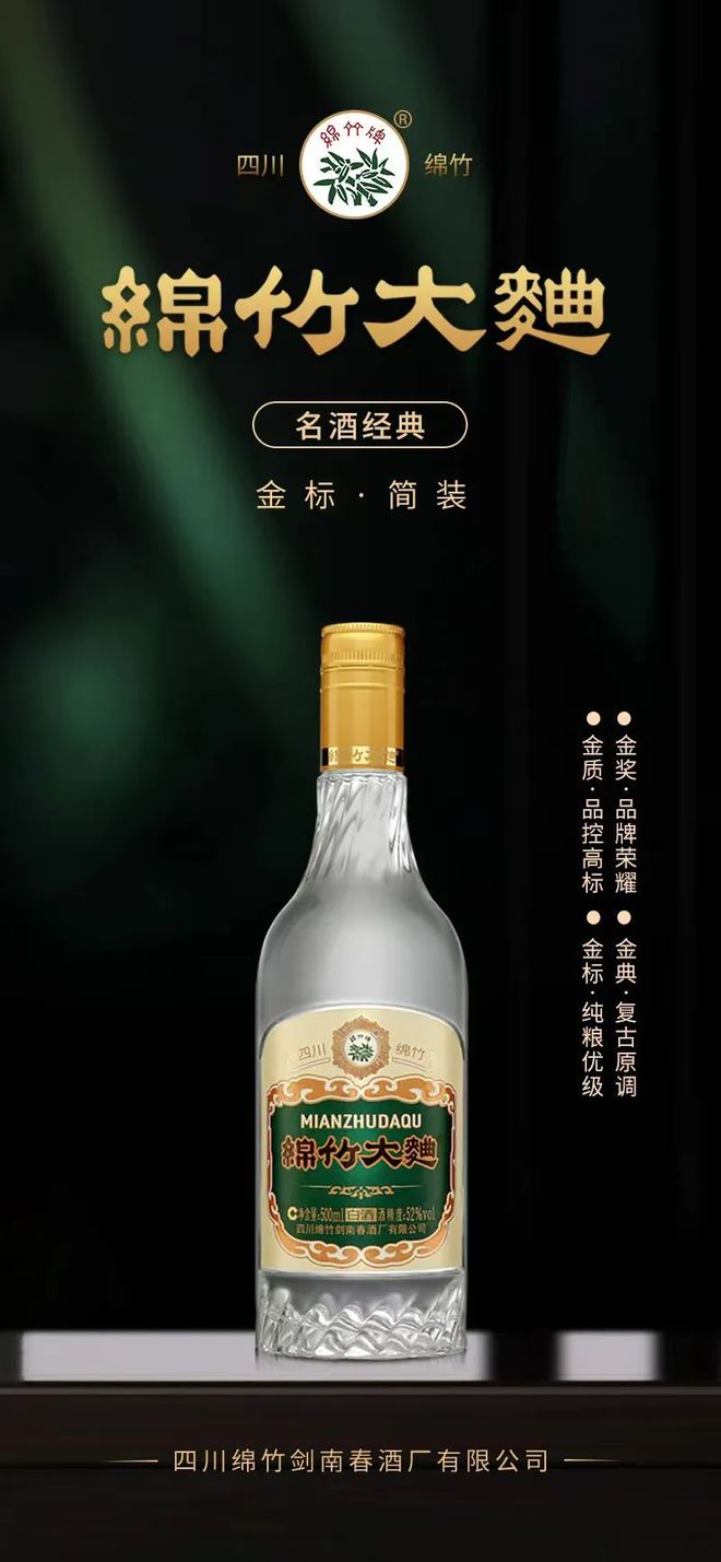 品质上,在绵竹产区的赋能之下,采用五粮配方,以千年老工艺结合纯粮固态酿造,绵竹大曲(金标)酒体采用优级纯粮基酒+陈年调味酒,并由剑南春酒厂酒体中心专家团队精心勾调设计,保证了芳香浓郁、纯正典雅、甘冽净爽、余香悠长的优秀品质。